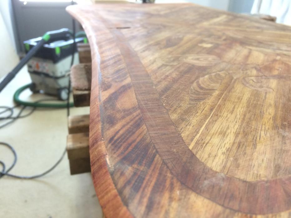 - Restauration du placage par l'ajustage sur-mesure de greffe de satiné 12/10eme en bois scié