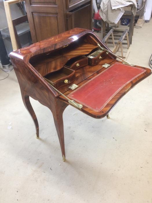 Restauration d’un secrétaire de dame estampillée MIGEON (1696-1758). Placage de Satiné