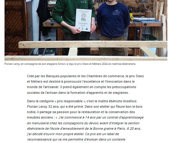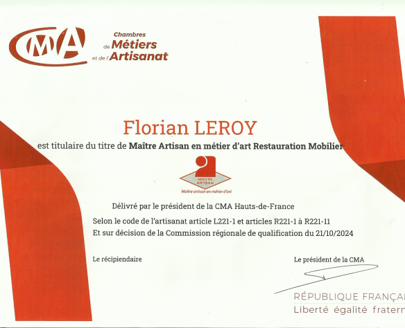 Le 18 novembre 2024, La Chambre Des Métiers des Hauts-de France à remis la plus haute qualification qu'elle est en mesure d'attribuer à un artisan en élevant au titre de Maître Ebeniste en conservation de mobilier ancien M. LEROY FLORIAN. Reconnaissant des 18 années d'engagement dans la poursuites des techniques ancestrales, de l'engagement des techniques innovantes et la formation de nombreux apprenti(e)s.